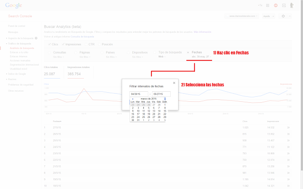 2) Por defecto, Google Search Analytics está preparado para mostrarte las búsquedas de los últimos 28 días, pero puedes modificar la fecha con la que deseas visualizar las citadas búsquedas para llegar hasta 90 días: