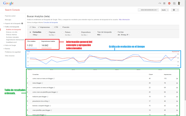 Al incluir nuestra web en las Herramientas para webmaster de Google, todas las consultas de búsqueda que los usuarios realizan en el buscador, se registran para que luego podamos analizarlas y estudiarlas para descubrir qué contenidos de los que publicamos son los que más tráfico o menos tráfico suscitan.
