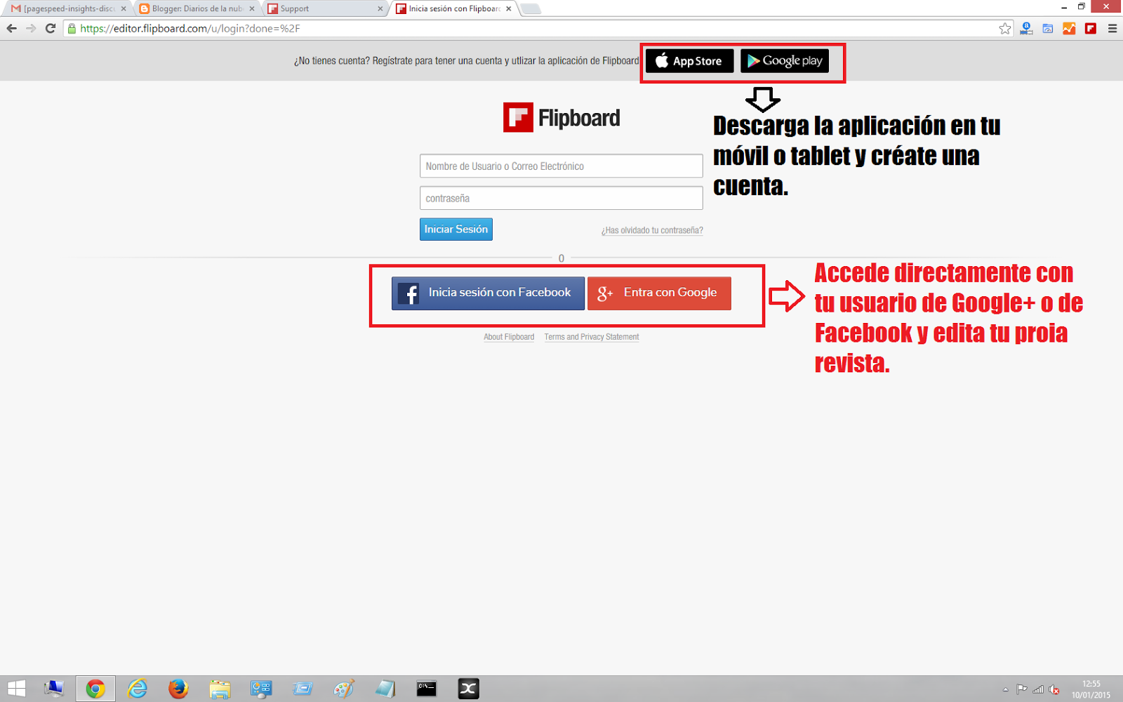 a) Accede desde la propia web utilizando tu cuenta de Google+ o de Facebook.