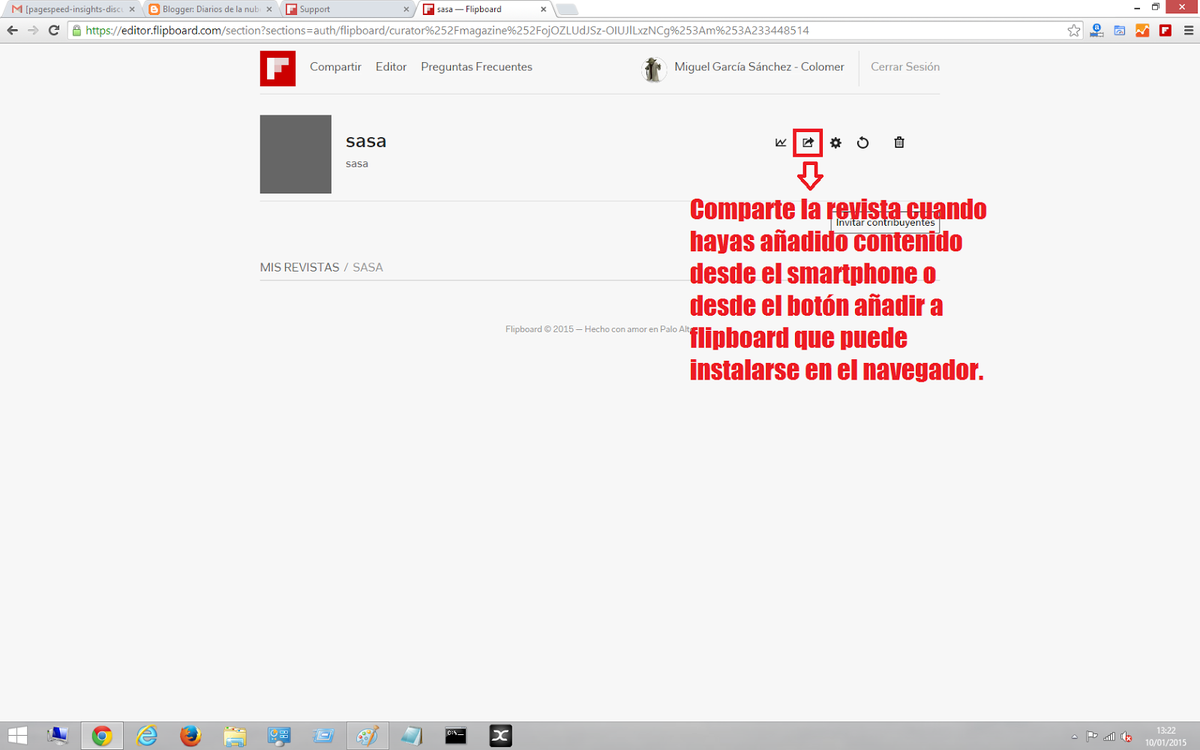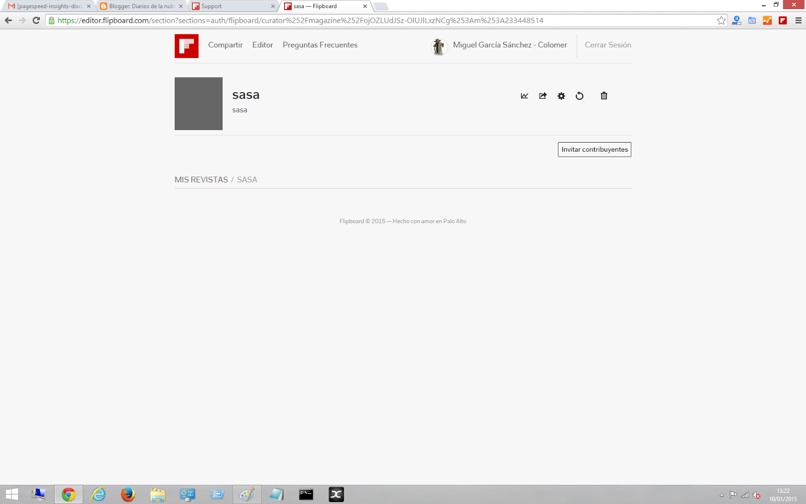 PASO 6) Desde el editor ya poco más podrás hacer. Puedes invitar a otros contribuyentes, consultar estadísticas... pero lo más importante, añadirte las entradas de tu Blog, debes hacerlo o con la aplicación para móvil o tablet o con el botón añadir a Flipboard que se puede poner en tu navegador.
