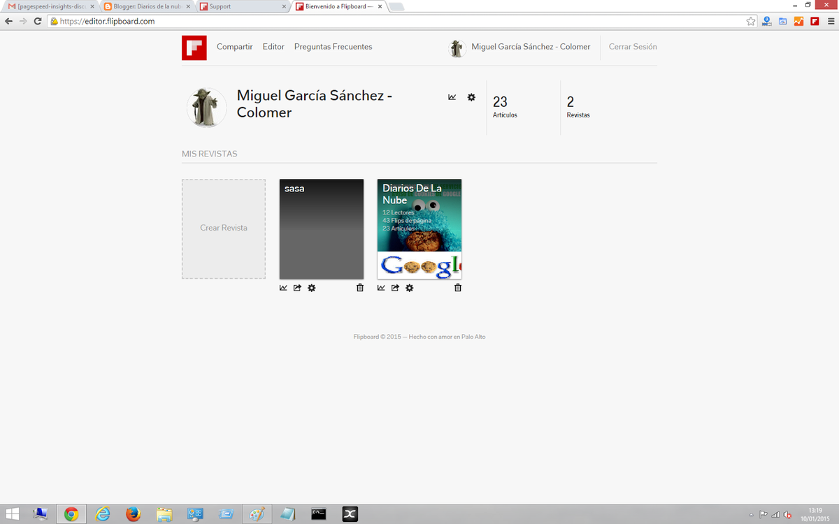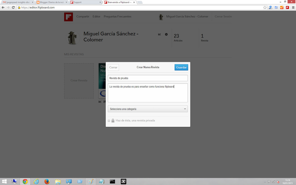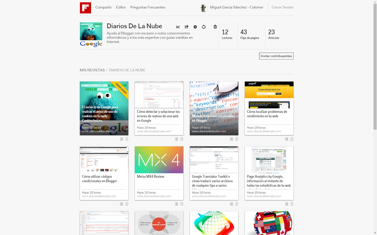 Cuando termines puedes visitar tu revista en el editor de revistas Flipboard e ir viendo cómo va quedando. Abajo una imagen con la revista creada con algunas entradas: