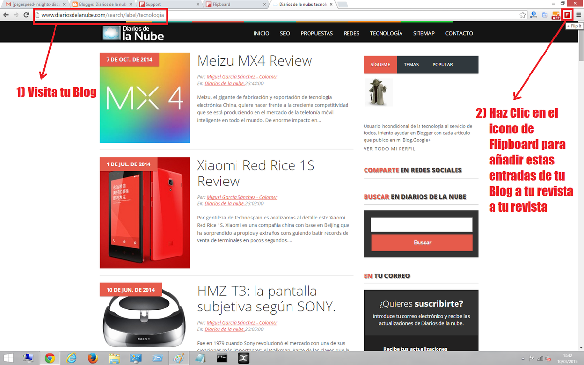 Visita tu propio Blog y dale al icono de Flipboard para añadir tu entrada a la revista (sigue los pasos de la imagen):