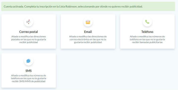 Este enlace nos llevará a nuestro panel de control de la Lista Robinson. Desde aquí podremos añadir direcciones postales, cuentas de email, números de teléfono y SMS.