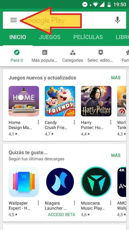 Abre la Play Store de Google y pulsa sobre el menú desplegable del margen superior izquierdo (3 líneas horizontales).