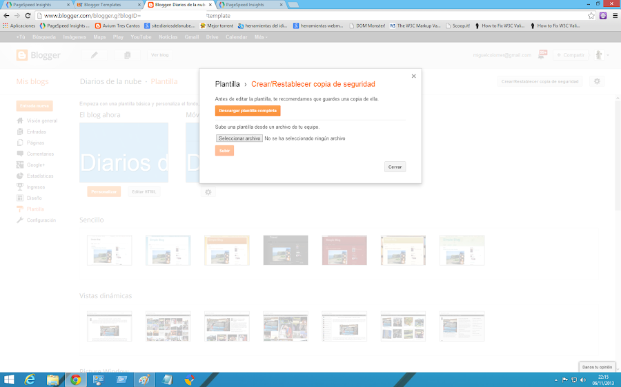 Es conveniente que saques "pantallazos" o imágenes de cómo tenías el Blog ates del cambio de plantilla. Aunque hagas la copia de seguridad, al utilizar una nueva plantilla los gadgets se "recolocarán" y tendrás que volver a ponerlos como los tenías.
