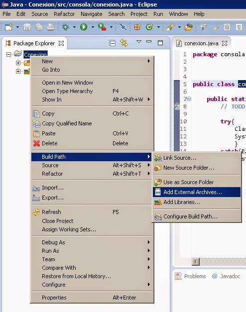 Ahora agregaremos la dependencia de nuestro archivo .jar. Para ello haremos clic derecho en el proyecto y seguiremos la ruta Build Path>Add External Archives...