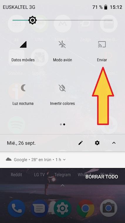 Para emitir en pantalla grande solo tenemos que pulsar el botón de “Enviar” que aparece en el desplegable de ajustes rápidos del terminal. Algunas aplicaciones también suelen incluir este botón dentro de sus correspondientes menús, dentro de la propia app (YouTube, navegador, etc.).