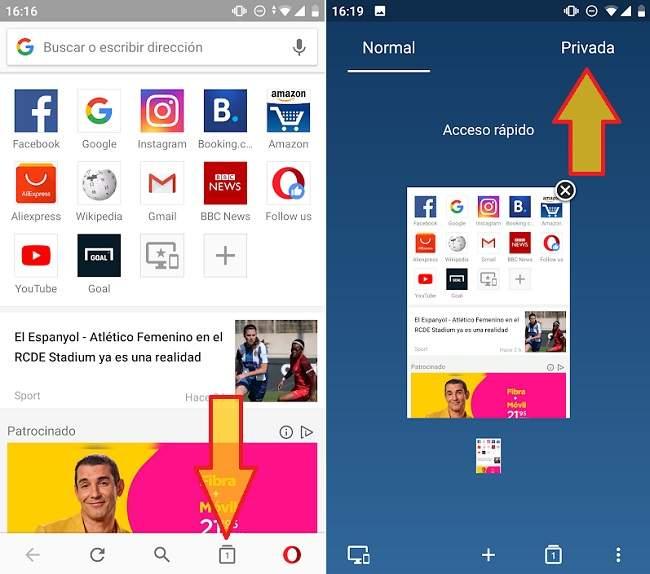 Para acceder a los ajustes de configuración del VPN de Opera primero tenemos que abrir una pestaña privada (desde el menú de pestañas en la barra inferior) y pulsar sobre el botón de “Configuración”.