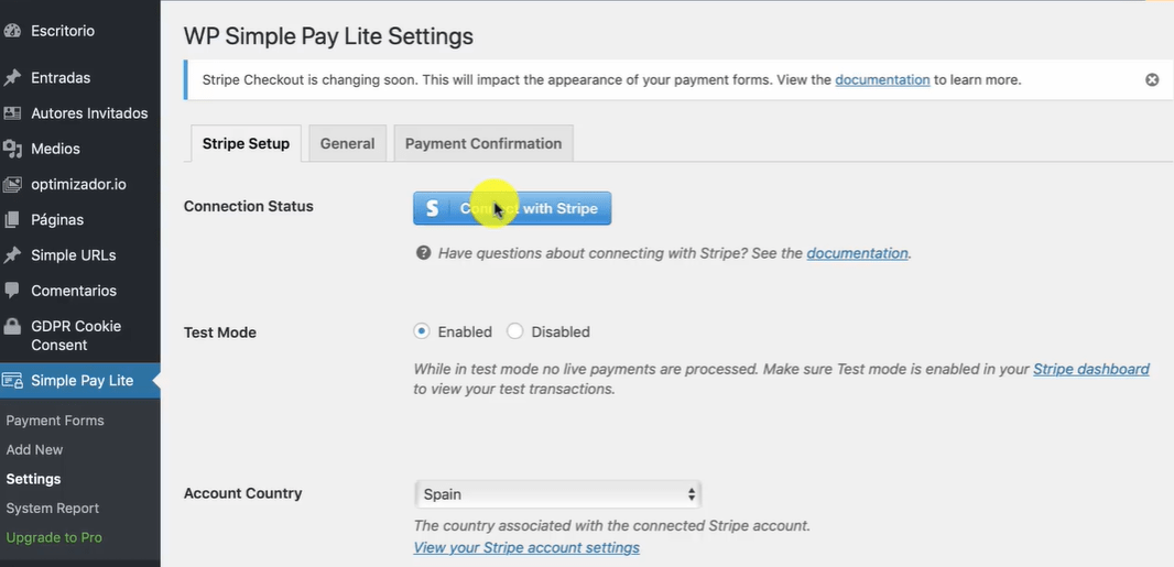 Lo primero es conectar tu cuenta de Stripe con el plugin pulsando sobre el botón «Connect with Stripe» como aparece en la siguiente imagen.