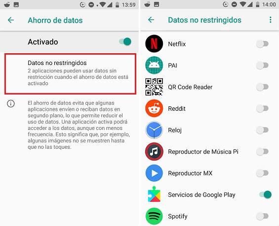 Lo bueno es que el sistema nos permite discriminar ciertas aplicaciones para que no se les aplique esta restricción de datos. Para ello, en el menú de “Ahorro de datos”, solo tenemos que activar la pestaña, pulsar sobre “Datos no restringidos” y seleccionar las aplicaciones que no queremos que sean bloqueadas.