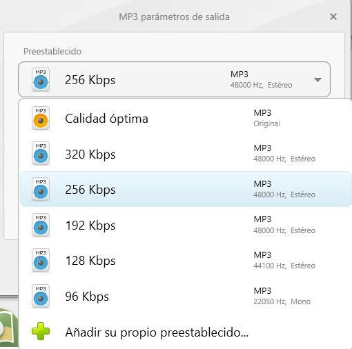 4- Aparecerá una nueva ventana donde podremos elegir la calidad del archivo MP3 resultante de la conversión (96Kbps / 128Kbps / 192Kbps / 256Kbps / 320Kbps / Calidad óptima y personalizada).