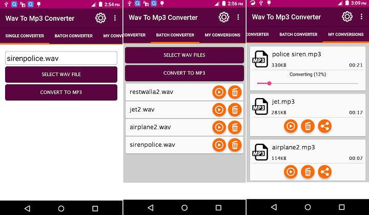 WAV to MP3 Converter: Este otro conversor tiene una interfaz más sencilla y directa, con botones bien grandes para que vayamos directos al grano. Al igual que la app anterior, permite hacer conversiones en masa.