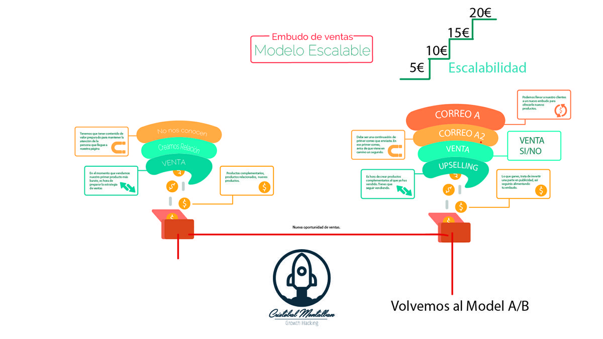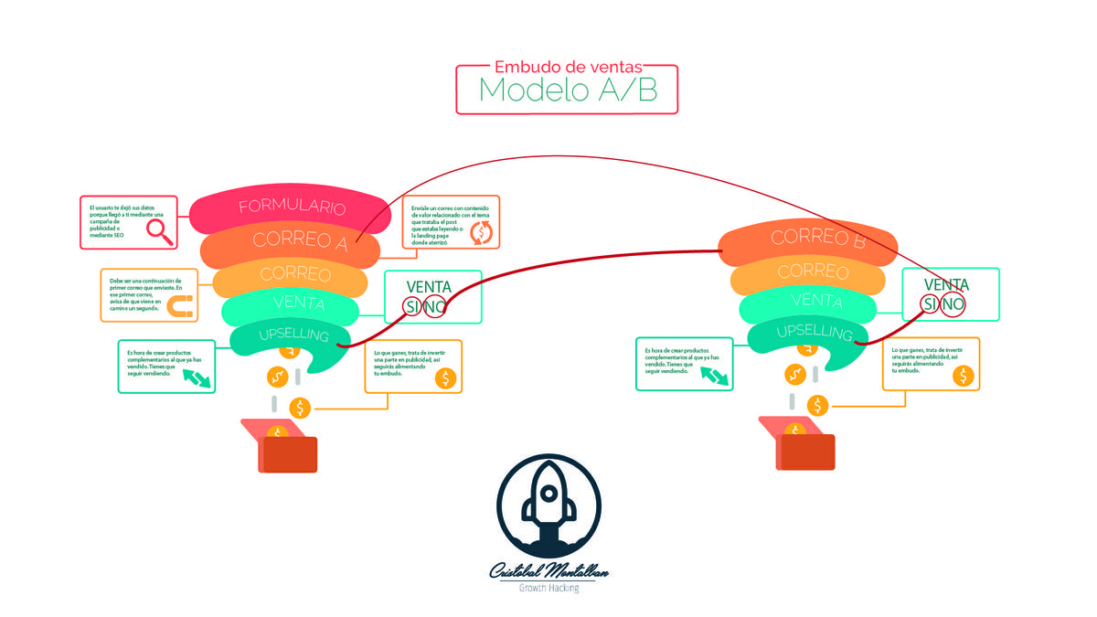 En la siguiente imagen te dejo una infografía en la que se puede apreciar perfectamente el esquema que tienes que hacerte en tu cabeza para diseñar la estrategia del Funnel de ventas A/B