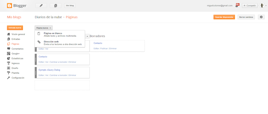 INSERCIÓN paso a paso en tu Blog:1) El script siempre residirá en una página del Blog. Por ello, es conveniente que en primer lugar, dentro de Blogger creemos en nuestro Blog una página que albergará el citado índice: