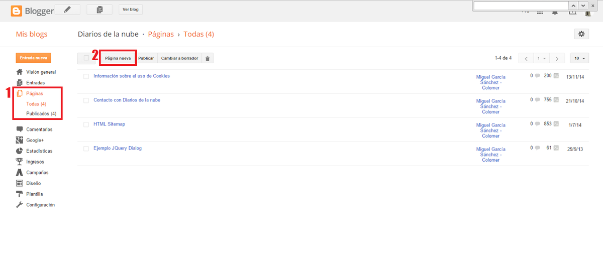 Para más detalles fíjate en la pantalla inferior y cómo te he remarcado con un recuadro rojo y un número 1 la zona donde debes pulsar en "Páginas" y después te remarco con un cuadro rojo y el número 2, la zona donde debes pulsar para crear la página, haciendo "clic" en "página nueva".