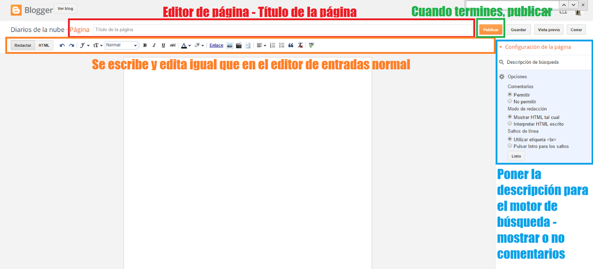 2) Ahora se te abrirá el editor de páginas de Blogger. Se maneja exactamente igual que el editor de entradas: