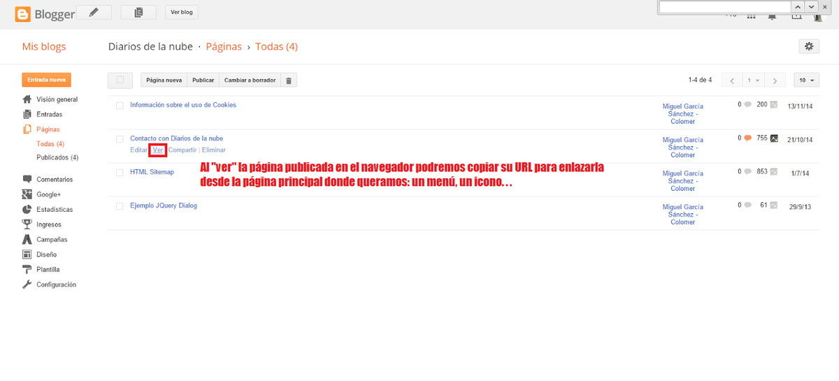 Para poderla conectar desde algún punto del Blog dale a "VER" y se te abrirá en el navegador directamente la página que has creado dentro de tu Blog. Aprovecha y cópiate la dirección que Blogger le ha dado a la página que has creado para que la puedas añadir donde necesites.