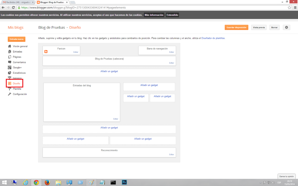 2) Ahora, dirígete en Blogger a la pantalla principal y en el menú izquierdo de opciones pulsa en "Diseño" tal como muestro en la pantalla inferior.