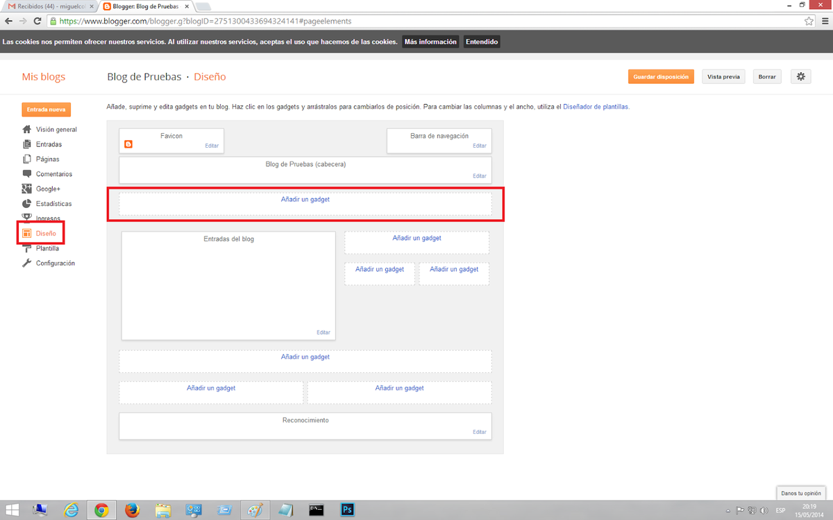 3) Haz "clic" en cualquier punto donde ponga "Añadir un gadget", especialmente si se encuentra bajo la cabecera del título (CONSEJO: si lo pones en otro punto de la vista de diseño, el menú se adaptará a la forma de ese punto y no tendrá el aspecto alargado y horizontal).