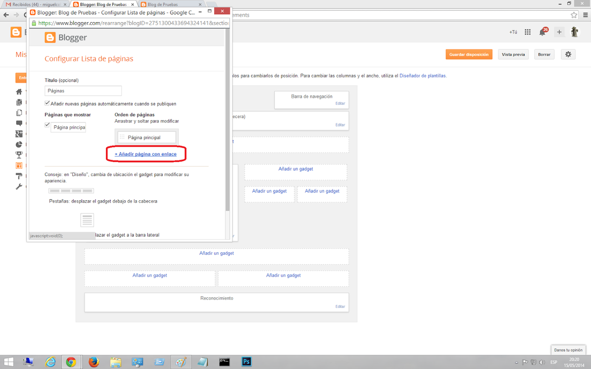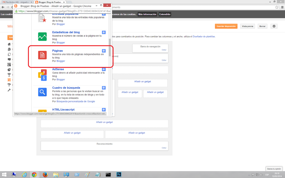 4) Selecciona en la pantalla que te sale el Gadget de Google "Páginas", tal y como te marco en el pantallaoz inferior.