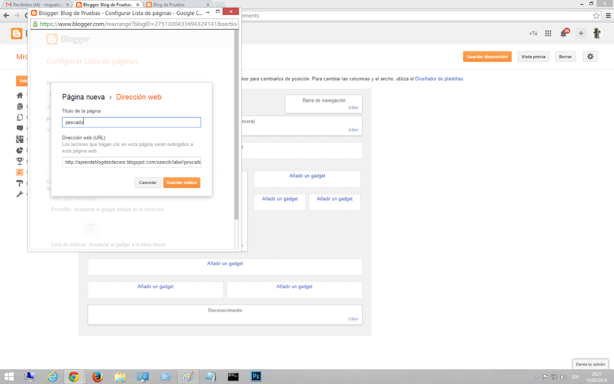 7) En "Dirección web (URL)" escribe:http://nombreDelBlog/p/nombredelapagina.htmlEs decir, pega la dirección de la página que extraíste en el paso 3) de donde creaste la página por primera vez. Por ejemplo, en Diarios de la nube accedes a mi página de contacto porque en el gadget para menú que te he descrito añadí la dirección de mi página de contacto: http://www.diariosdelanube.com/p/contacto-con-diarios-de-la-nube.htmlOtras opciones para añadir páginas a mi Blog