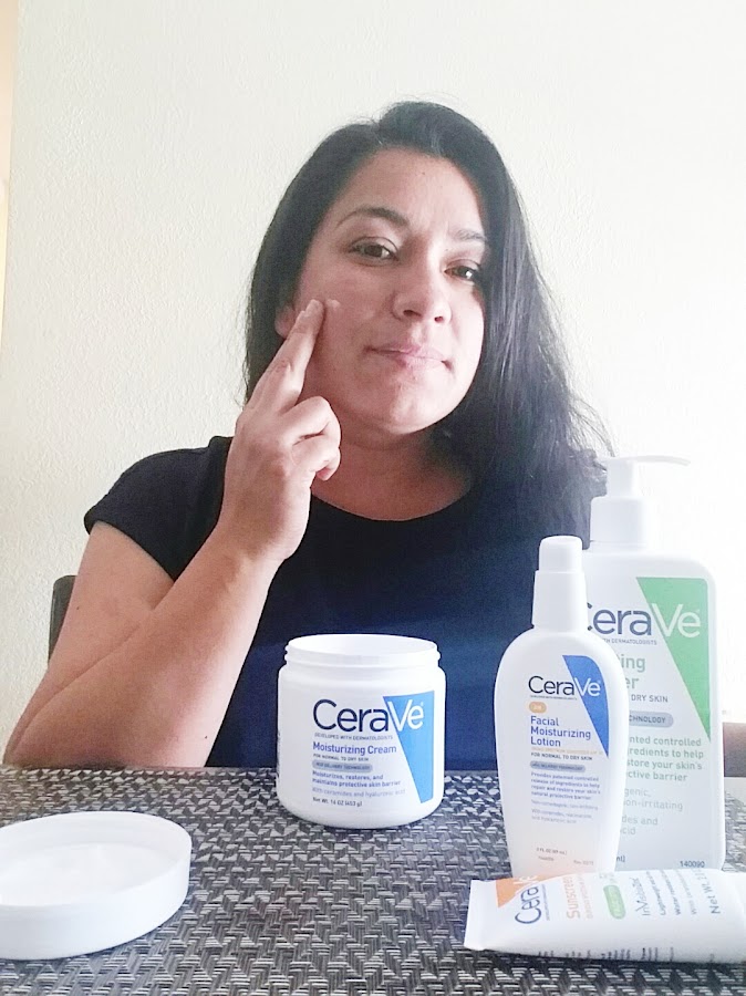 2. Me enjuago la cara con agua fría y seco con una toalla limpia. Una vez que mi rostro esta secó aplico una cantidad pequeña de CeraVe AM facial Loción hidratante o CeraVe Protector solar facial SPF 50.