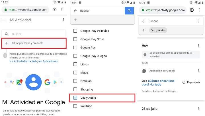 Podemos escuchar todas las grabaciones que Google tiene almacenadas desde la página Mi Actividad de Google.Pulsamos sobre “Filtrar por fecha y producto”.
