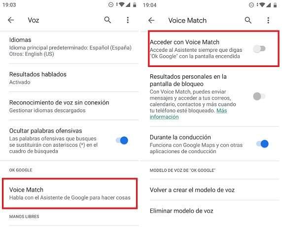 Por último, dentro de este menú, seleccionamos “Voice Match” y desactivamos la pestaña “Acceder con Voice Match”.