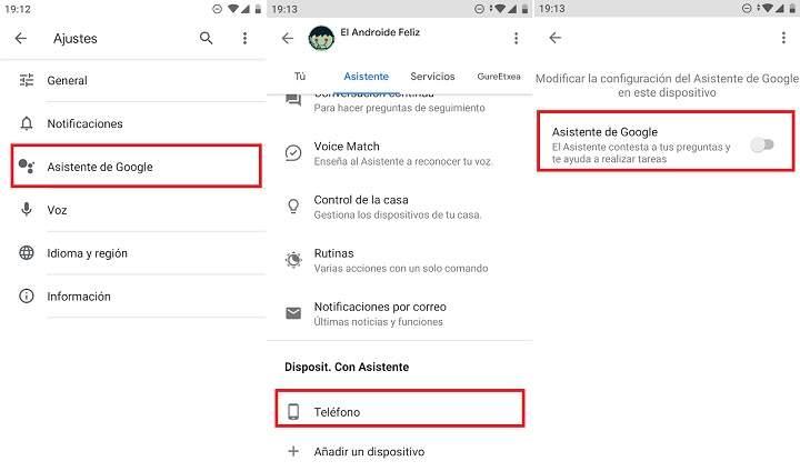 Por último, también podemos ir un paso más allá y desactivar por completo el Asistente de Google. Para ello, vamos a “Ajustes -> Google -> La Búsqueda, el Asistente y Voice” y pulsamos sobre “Asistente de Google”.En esta nueva ventana, hacemos un scroll lateral para ir hasta el submenú “Asistente” y pulsamos en “Dispositivos con Asistente -> Teléfono”. Aquí encontraremos una pestaña llamada “Asistente de Google”. La desactivamos.