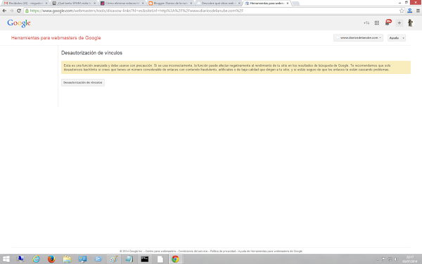 5) Sigue las instrucciones que Google proporciona en la herramienta para desautorización de enlaces.5.1) Extrae en un fichero todas las direcciones que has visto en la herramienta para visualización de sitios que enlazan tu web pulsando en ella "Descargar esta tabla".5.2) De todos los enlaces descargados, copia SÓLO en un fichero plano .txt aquellos que deseas desautorizar, poniendo delante la palabra domain delante de aquellos que sean direcciones de un sitio web completo (si son enlaces de una página en concreto no pongas domain, copia directamente el enlace a la página. Adicionalmente, informa de los motivos o las acciones que has emprendido para tratar de que esos enlaces se eliminen poniendo una # delante del texto explicativo. Un ejemplo de archivo para desautorización de enlaces sería así: #web_que_te_hace_spam.com he intentado contactar con ellos pero no da resultado domain:web_que_te_hace_spam.comdomain:web_que_te_hace_spam2.com http://web_que_te_hace_spam.com/página_en_concreto.html5.3) Sube el archivo plano .txt con toda la información explicada en el paso 5.2 y si todo está correcto, sete mostrará un aviso de confirmación que te dirá el número de dominios y enlaces desautorizados. Adicionalmente, recibirás un correo de las acciones realizadas a la dirección e-mail que tengas puesta como administrador en las herramientas para webmaster de Google.