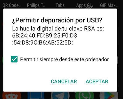 Si es la primera vez que utilizamos los comandos ADB en el móvil, veremos que aparece un mensaje de confirmación en la pantalla del teléfono que deberemos aceptar.