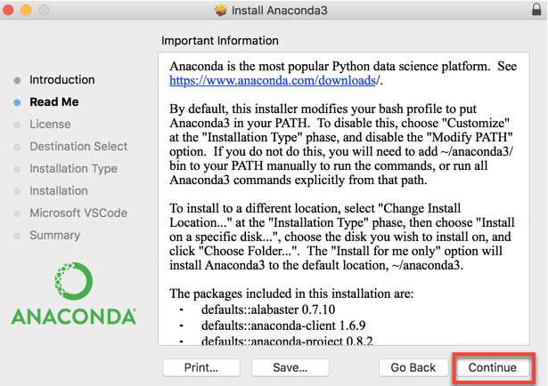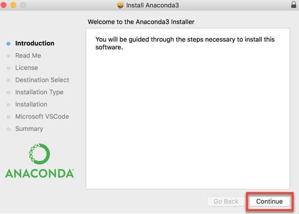 Paso 2) Ahora está listo para instalar Anaconda. Haga doble clic en el archivo descargado para iniciar la instalación. Es.dmg para mac y.exe para windows. Se le pedirá que confirme la instalación. Haga clic en el botón Continuar.