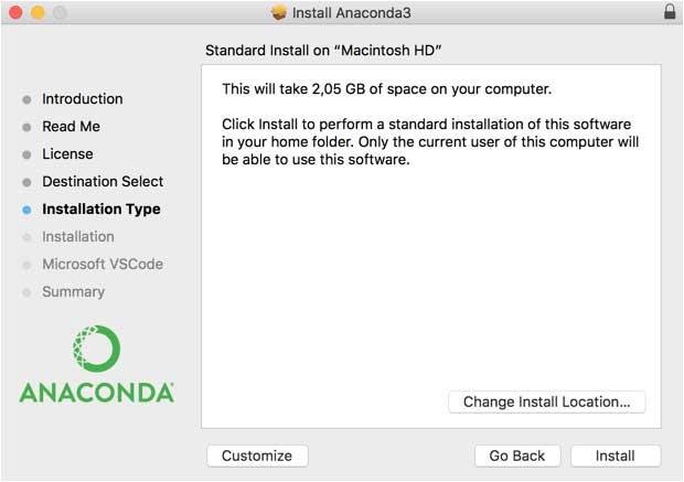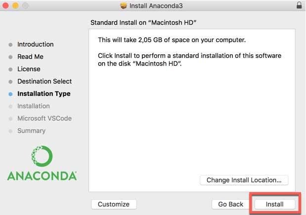 Paso 7) Ahora puede instalar Anaconda. Haga clic en Instalar para continuar. Anaconda ocupa unos 2,5 GB en el disco duro.