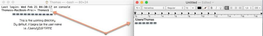 Si la ruta en el editor de texto no coincide con el directorio de trabajo, puede cambiarla escribiendo cd PATH en el terminal. PATH es la ruta que ha pegado en el editor de texto. No olvide envolver la ruta con "PATH". Esta acción cambiará el directorio de trabajo a PATH.