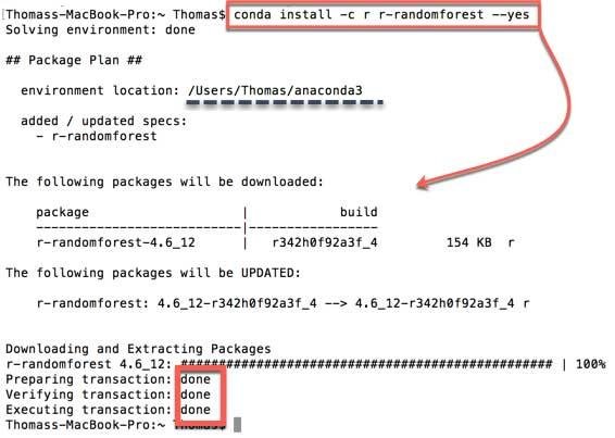 Ejecute conda install -c r r-randomforest --sí desde el terminal.