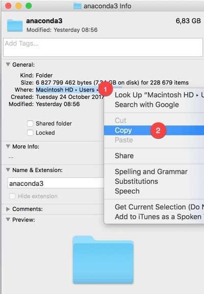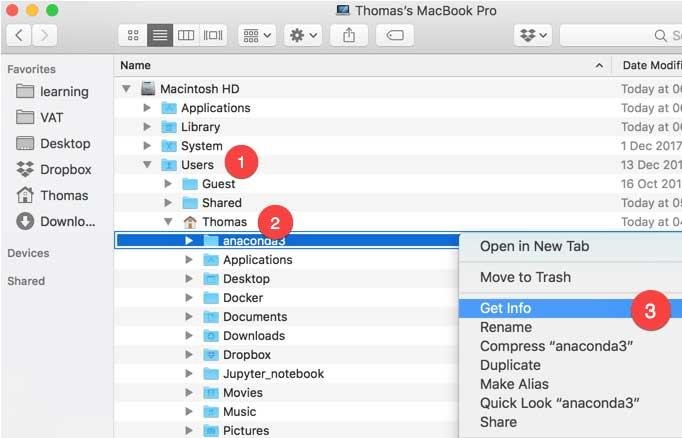 Abra Ordenador y seleccione Usuarios, NOMBRE DE USUARIO y anaconda3. Confirma que instalamos Anaconda en el camino correcto. Ahora, veamos cómo macOS escribe la ruta. Haga clic con el botón derecho y, a continuación, Obtener información