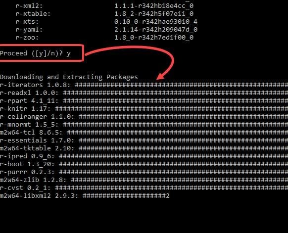 Paso 4) Estamos listos para instalar R. Le recomiendo que instale todos los paquetes y dependencias con el comando conda en el terminal.
