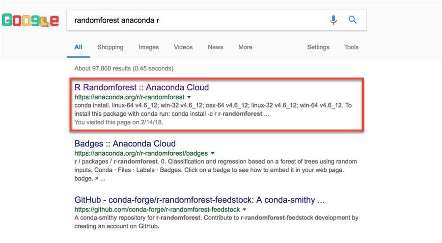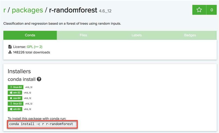 Por ejemplo, necesitamos instalar randomForest para el tutorial sobre el bosque aleatorio; vamos a https://anaconda.org/r/r-randomforest.