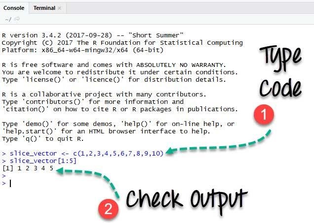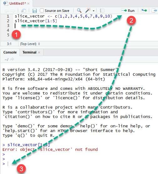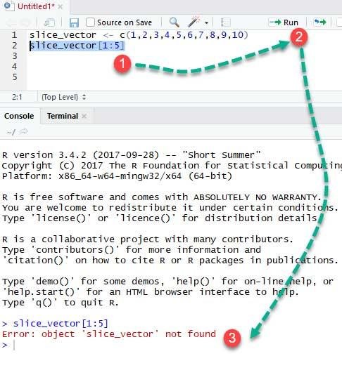 Advertencia: En la segunda fila (es decir, slice_vector[1:5]), la Consola muestra un error. Es decir, no corrimos la línea número uno.