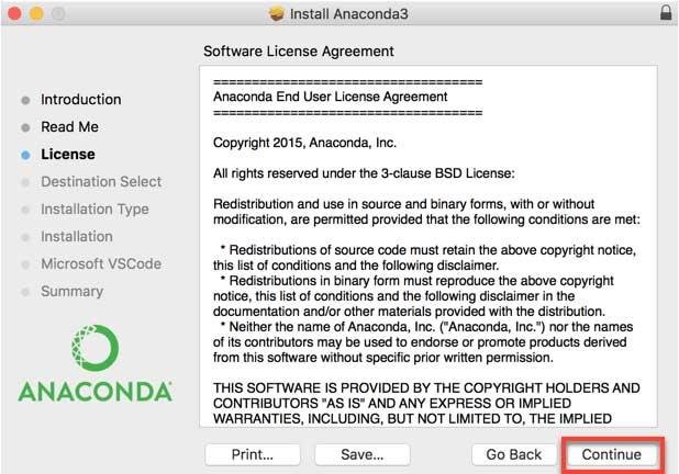 Paso 4) Esta ventana muestra el Contrato de Licencia de Usuario Final de Anaconda. Haga clic en Continuar para aceptar.