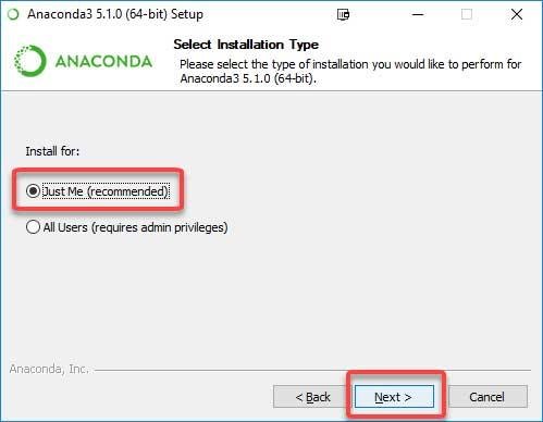 Seleccione el destino haciendo clic en Instalar sólo para mí. Esto significa que Anaconda será accesible sólo para este usuario.