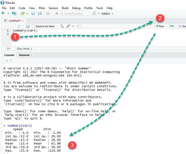 Escribe el código en el guión. Podemos escribir tantas líneas de códigos como queramos. Para ejecutar el código, simplemente seleccionamos las filas que queremos devolver. Finalmente, haga clic en Ejecutar. Podemos ver la salida en la Consola. Podemos guardar nuestro script y abrirlo más tarde. Nuestros resultados no se perderán.