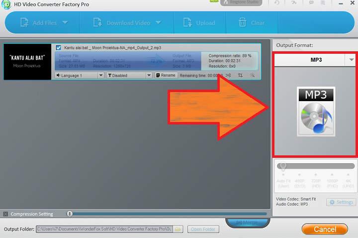 Este es un punto interesante, ya que, si queremos guardar un videoclip en formato audio, podemos convertirlo a MP3, simplemente cambiando el “Output format” y seleccionando un tipo de audio (MP3, WAV, AAC, FLAC, politono, etc) a la hora de convertir el video.