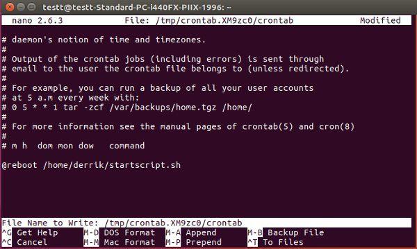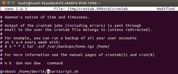 Dentro del nano editor en el terminal, desplácese hasta la parte inferior y empiece escribiendo «@reboot». El comando reboot es clave aquí ya que le dice al cron al reiniciar este comando que se ejecute cada vez. Inmediatamente después de reiniciar, agregue la ruta completa del archivo al script de bash.