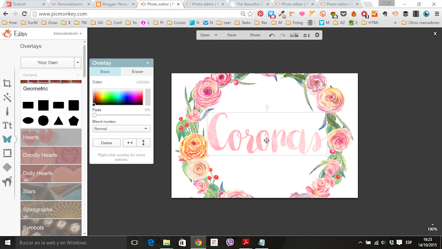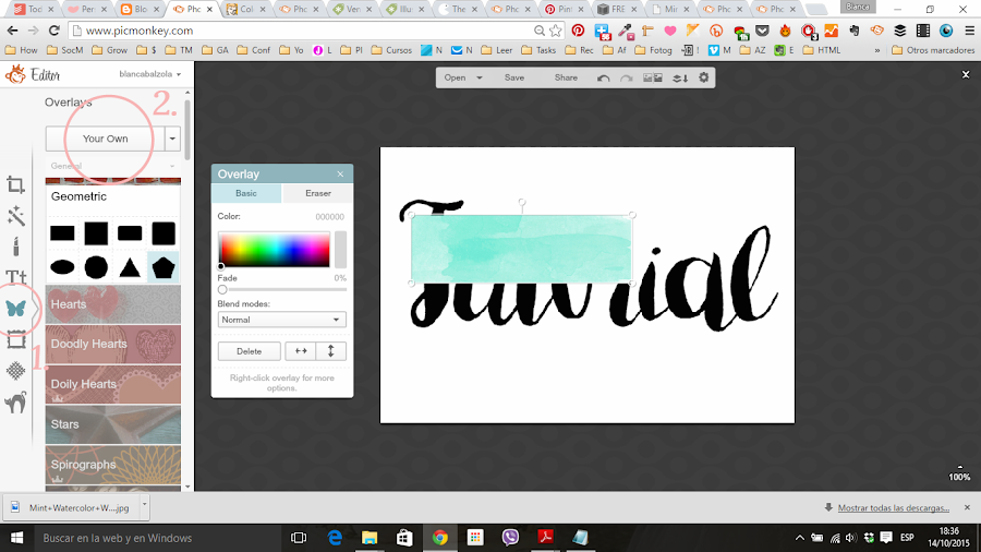 4) Subimos nuestra acuarela recortada a PicMonkey como nuestra propia Overlay (1º en donde el dibujito de la mariposa - 2º donde dice arriba del todo Your Own)