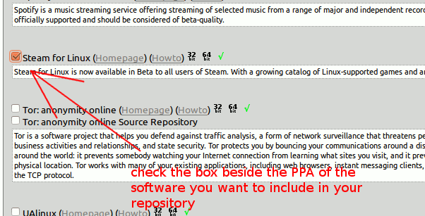 5. Además de las fuentes principales, el Generador también incluye PPAs populares como Cairo Composite Manager, Cortina Wallpaper changer, GIMP, Google Chrome, Virtualbox, Steam, Spotify, etc. que puedes incluir en tu lista de fuentes. Simplemente marque la casilla al lado del PPA.