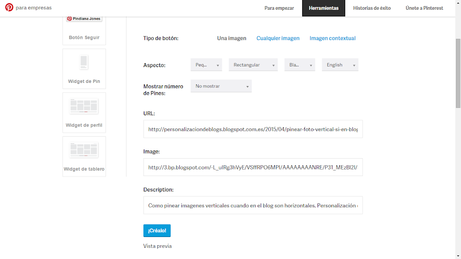 5) Ponéis el botón de pin it debajo de la imagen horizontal, pero poniendo en donde la URL de la imagen, la de la vertical que acabáis de guardar y no la de la que tenéis (vais a publicar) en el post