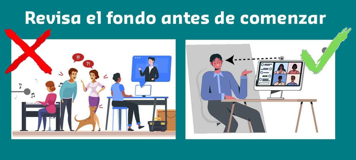 Tener un espacio adecuado para esto es importante pues con un buen escenario puedes transmitir seriedad y tus compañeros podrán verte bien.Elige una pared vacía o blanca con algún cuadro o lo que prefieras. Evita escenarios demasiado saturados o que se vean desordenados.
