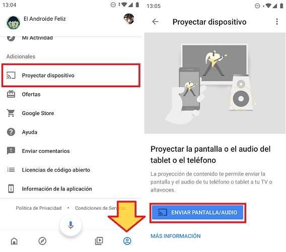 Si tenemos un Chromecast en casa también podemos utilizar KODI para enviar contenido en streaming a la pantalla de nuestra TV. En este caso, tenemos 2 opciones posibles.Google Home: Abre la app de Google Home, ve a la pestaña de “Cuenta”, pulsa sobre “Proyectar pantalla/audio” y selecciona tu dispositivo Chromecast. De esta forma, enviaremos cualquier cosa que se muestre en la pantalla del móvil, incluido KODI. Lo malo de esta opción es que requiere mantener la pantalla activada en todo momento, lo que hace que el consumo de batería sea bastante importante.