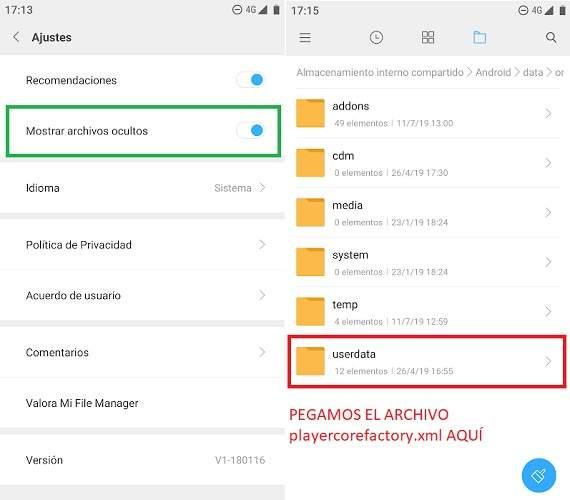 A continuación, abrimos el explorador de archivos de nuestro móvil (si no lo tenemos podemos instalar alguno como Mi File Manager) y ajustamos la configuración para que muestre archivos ocultos.